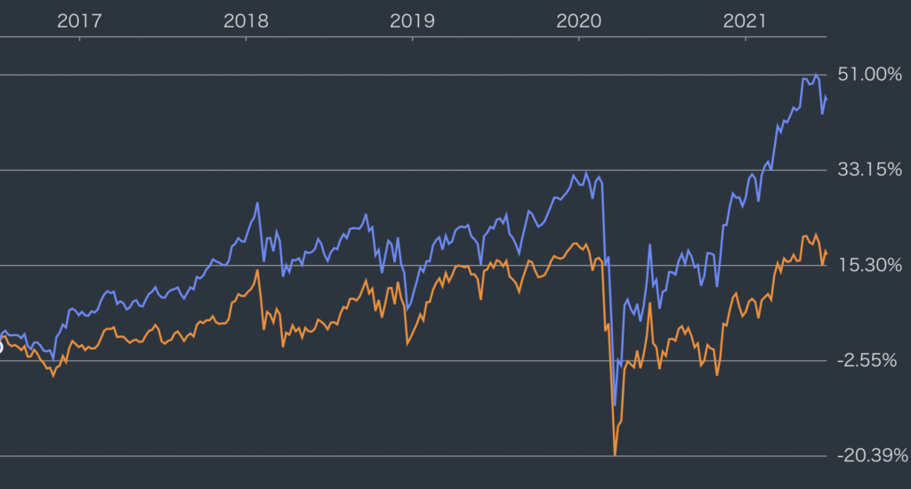 ただ、このHDVの魅力は、格付け会社のモーニングスター社の指数をベースとした高配当銘柄で構成されていることです。その結果、直近の配当利回りはVYMの2.87%を上回る3.61%(2021年6月現在)です。