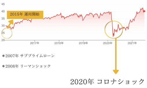 長期的にみると運用開始の2015年以降(コロナショック以外では)堅調に上昇推移しており、過去最高値を更新していきそうなのでもう少し様子を見ていきます。